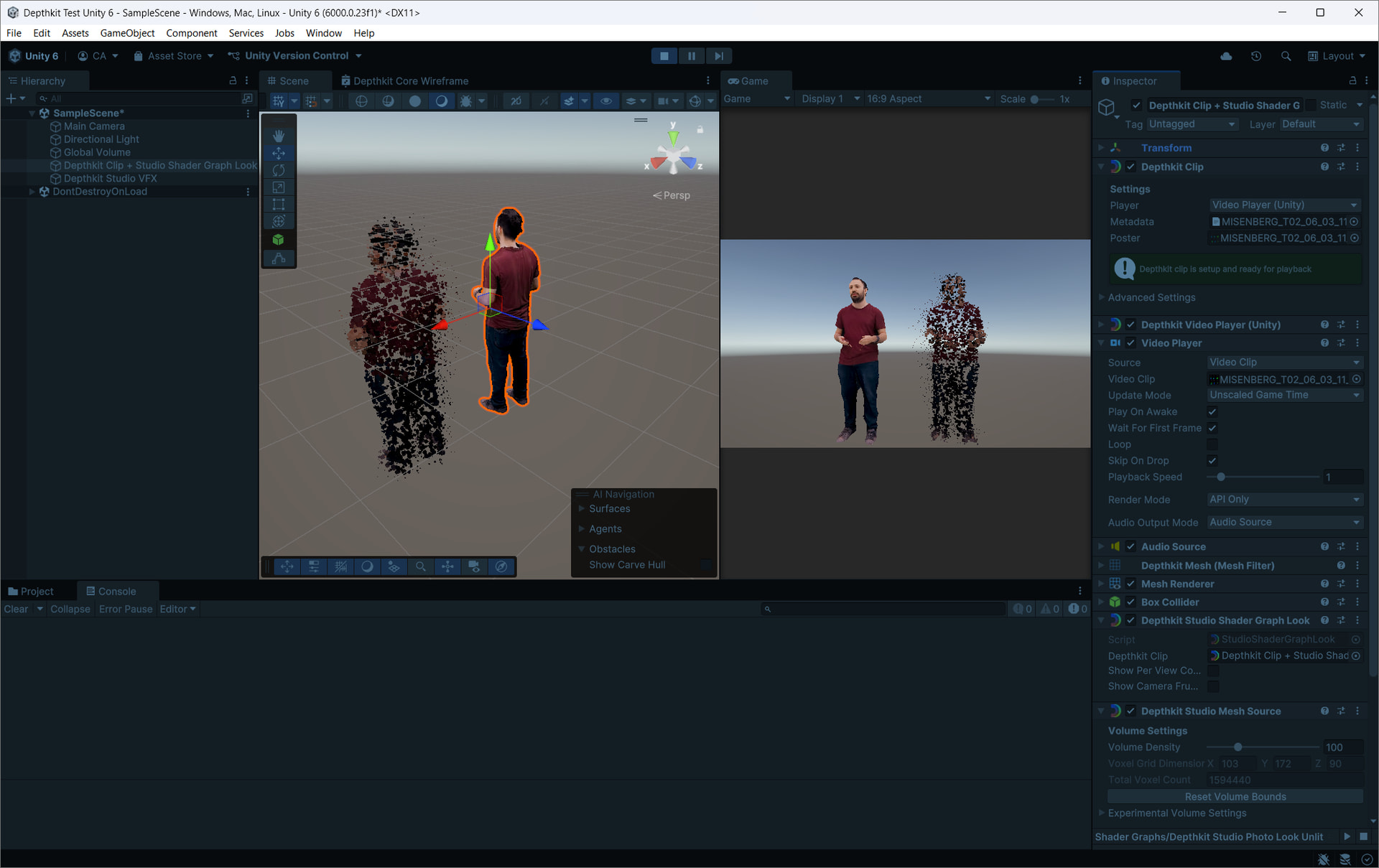There is a known issue with the Studio VFX prefabs, but you can still create an object with the Depthkit Studio VFX look from scratch by adding the ‘Depthkit Clip’ and ‘Depthkit Studio VFX Graph Look’ components to an empty object.